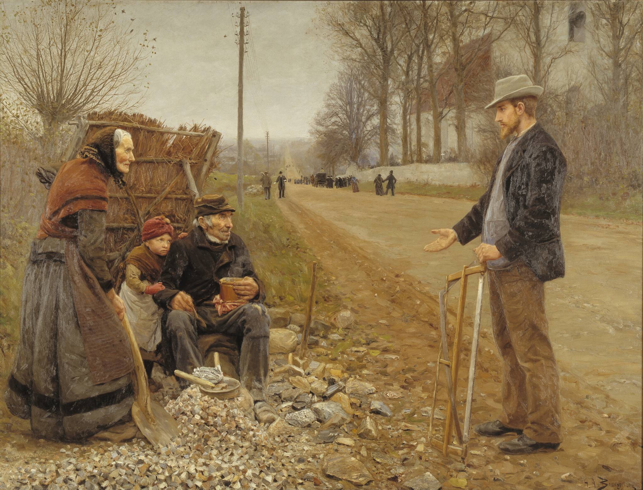 Nej, jeg tænker på samtalen som noget levende og menneskeligt. Som bringer os sammen og som kan opstå, nærmest ud af intet. Som jeg forestiller mig at det er sket i dette maleri af Brendekilde fra 1893.
